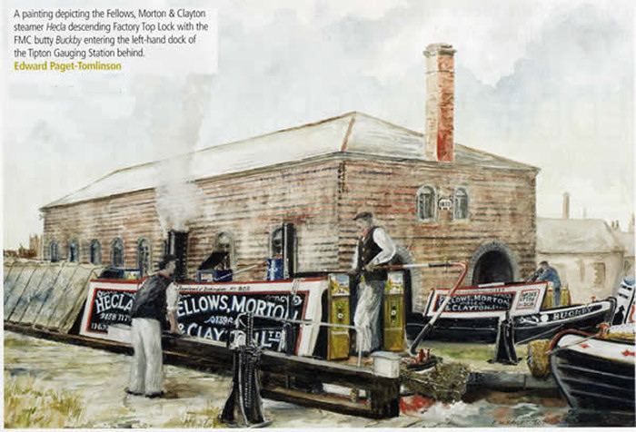 A painting by Edward Paget-Tomlinson depicting the Fellows, Morton & Clayton steamer HECLA descending Factory Top Lock with the FMC butty Buckby entering the left-hand dock of the Tipton Gauging Station behind.
