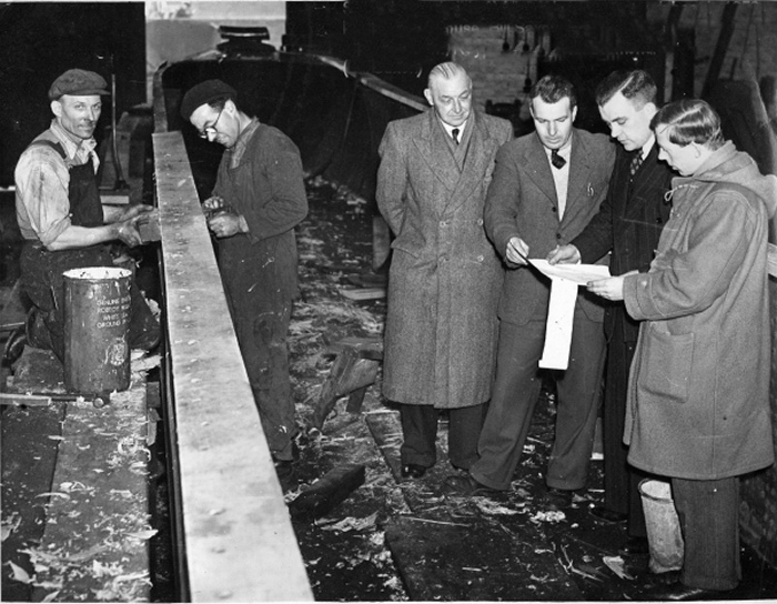 Start of the rebuild of VULCAN as a youth club boat in 1953. l-r Sam Stackhouse, Bill Saxon, Ernie Thomas, Jack Bradburn, Ray Thomas, John Diamond.
